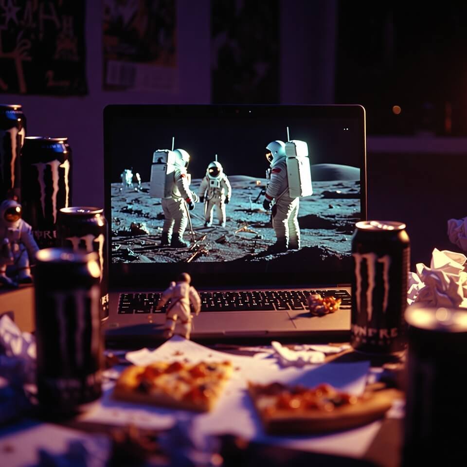 Late-night laptop showing Apollo 11, pizza, and Monster cans